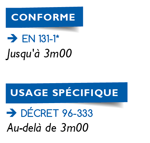 C’est un produit dit à usage spécifique. L’échelle de 2m, 2m50 et 3m est considérée comme une « échelle simple ». Ces modèles sont conformes à la norme EN 131-1.